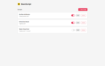 BareScript är en lätt användarhanterare för skript som möjliggör körning av anpassad JavaScript-kod på valfria webbplatser. Den erbjuder en enkel instrumentpanel för att skapa och hantera skript, med funktioner som att aktivera eller inaktivera skript individuellt samt en global av/på-omkopplare. Användare kan enkelt ange URL-mönster för att styra var skripten ska köras, vilket gör det flexibelt och kraftfullt för webbanpassningar.